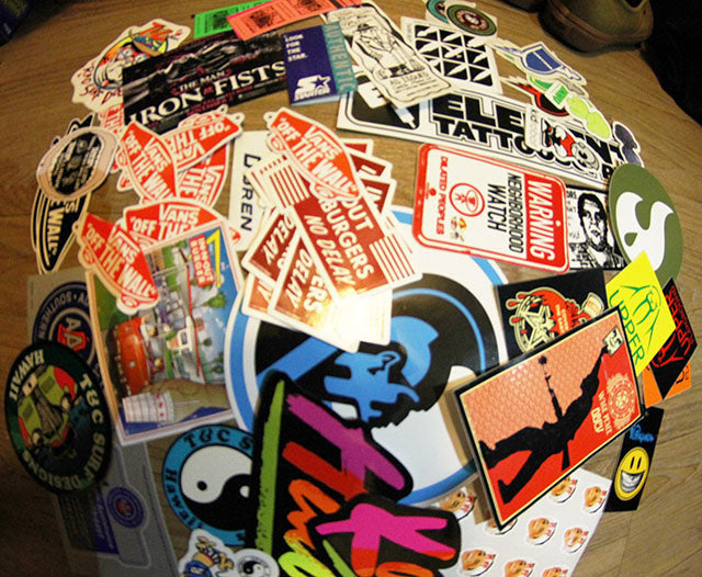 I have stacks of them kept in empty shoeboxes. Growing up I always stuck them on my bedroom door, overlapping each other as I tried to cover all the empty spaces. As shit got lame, a cooler sticker took its place, red faded to pink, corners would slowly peel and collect dust. From covering a MacBook to a Restroom stall they serve as visual entertainment and self-expression. Here are a few stickers from my collection that I managed to save. If you have any laying around send them my way.
