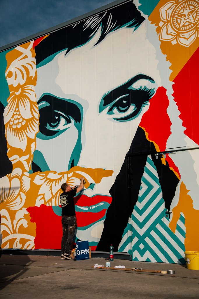 “May 24th was the opening of ‘Golden Future’ at Galerie Ernst Hilger. The show presents a selection of recent paintings, mixed media prints, mono-engravings, and retired stencils. I also had the opportunity to paint this mural entitled ‘Ideal Power Doves Vienna’ with the help of my crew Dan Flores, Nic Bowers, Rob Zagula and photos of course by Jon Furlong. Thanks to everyone who helped make it happen, including Ernst Hilger and his team. If you’re flying in and out of Vienna International Airport, stop by Terminal 1a to see the mural, or just look out your window when you takeoff or land! Thanks for caring!” – Shepard