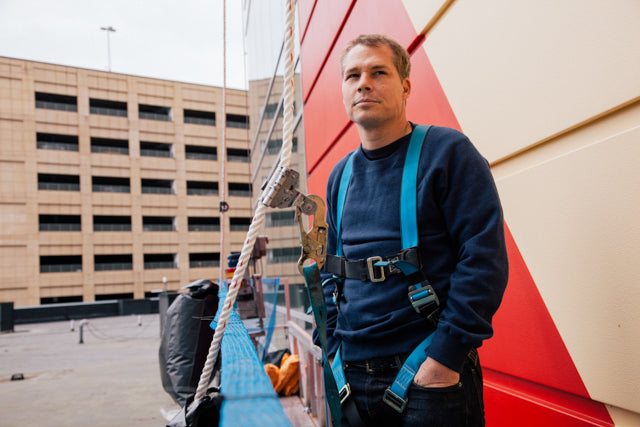 Shep getting ready to go 200 feet up. Day 1 weather report – 85 degrees and humid as shit.