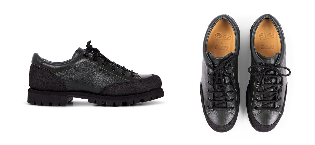 The core of this capsule is the Montana, a charming nod to 1970s climbing shoes. On a canvas of premium pebbled-leather, OBEY has embossed the tongue with the Icon Face – a bold symbol of counterculture devised by OBEY-founder and artist/activist Shepard Fairey. A subtle chartreuse-hue serves as accent stitching, an ode to the rugged Chartreuse mountains that rest across from the Paraboot factory in France.